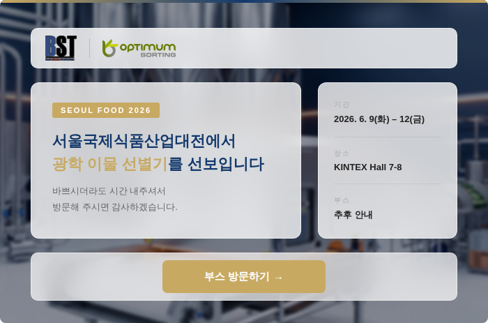 분체, 입체, 액상 원료의 이송 ·계량 ·저장 ·선별 ·혼합 ·건조 ·포장 등 통합 자동화 시스템의 설계, 제작 및 광학 이물 선별기를 통한 고객 맞춤형 종합 Engineering 서비스를 제공하는 BST입니다.